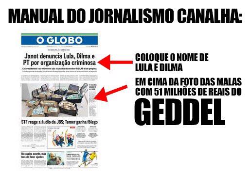 Portanto, são recorrentes delinquências desse tipo em que a mala encontrada no apartamento do larápio Geddel é posta sob uma manchete escandalosa, mentirosa e criminosa contra Lula, Dilma e o PT.